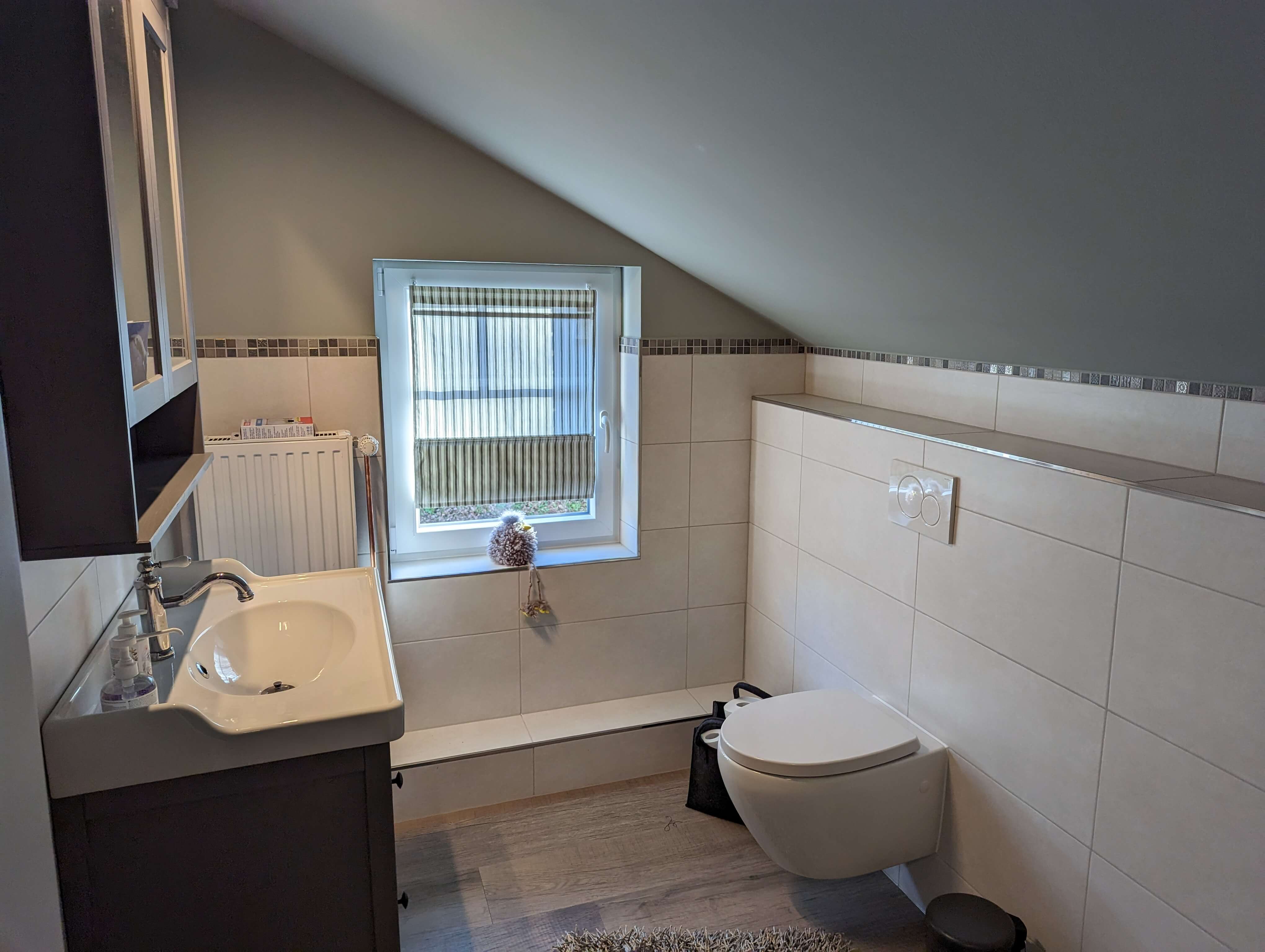 Die Badezimmer (eins im OG, eins im EG) verfügen über eine klare, ruhige Gestaltung mit neutralen Fliesen und modernen Sanitäranlagen. Eine geräumige Dusche und ein gut beleuchteter Spiegelbereich sorgen für Komfort und Bequemlichkeit. Praktische Ablageflächen und saubere Linien schaffen eine entspannende Atmosphäre.